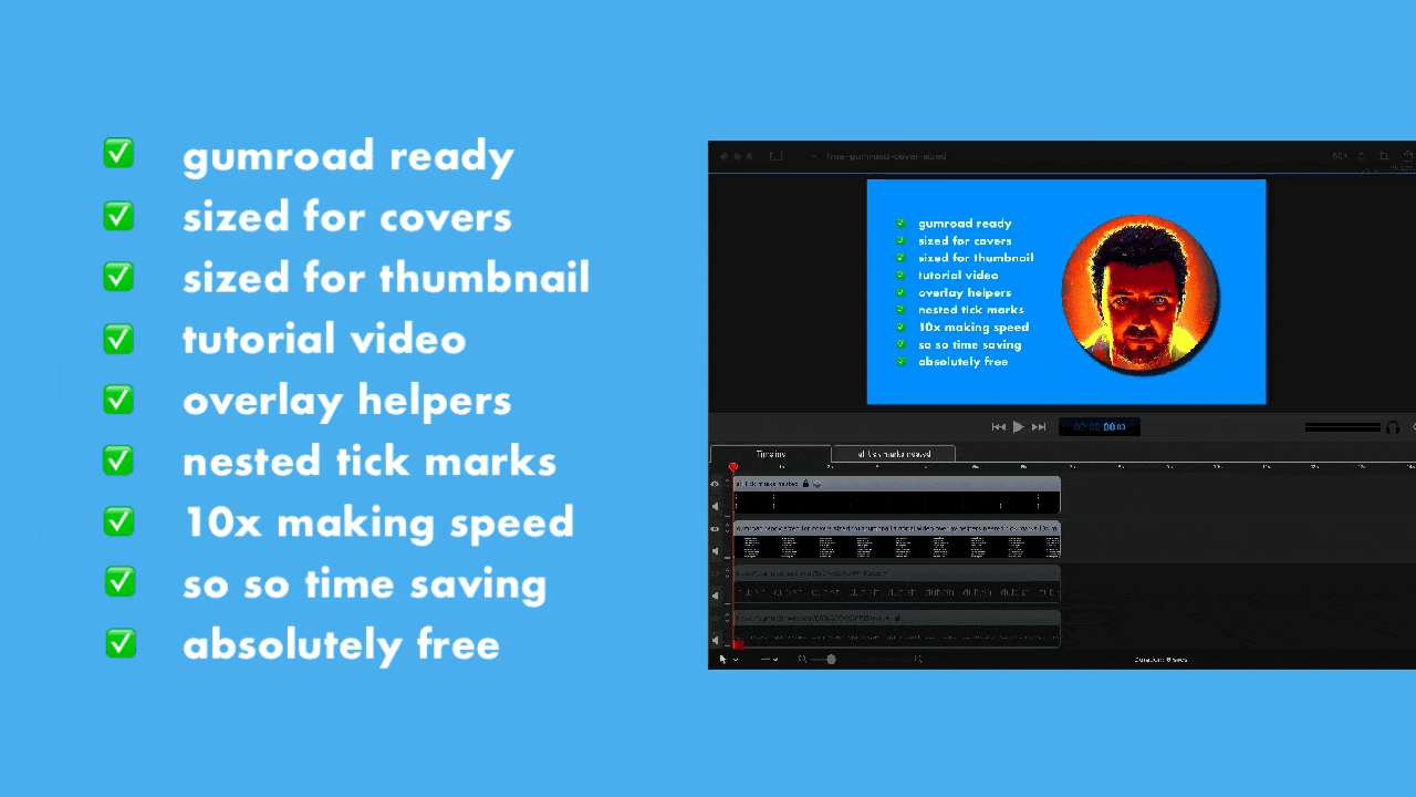 a new template for screenflow users that rapidly need to make COVERS and THUMBNAIL for use inside of gumroad. drag in your existing graphics and rapidly size for output for adding a new product for gumroad.
